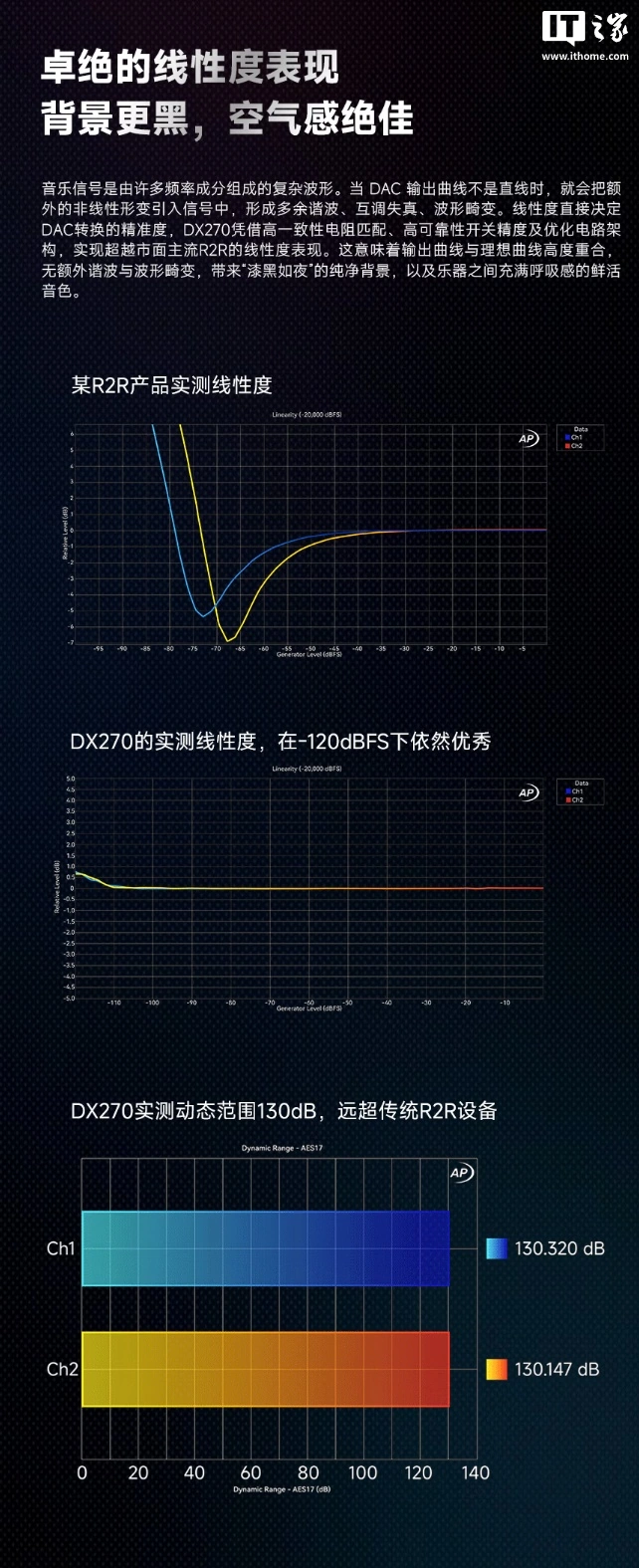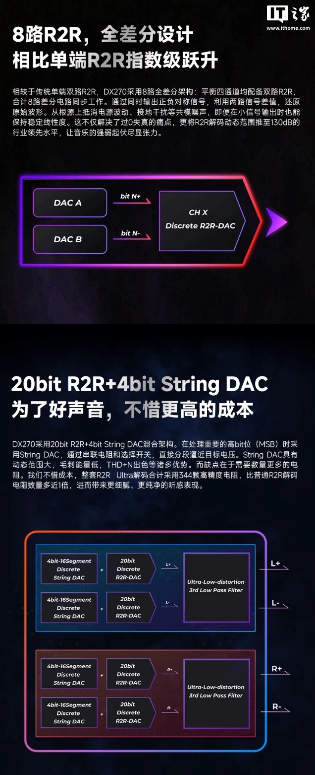据介绍,这款播放器搭载20bit R2R+4bit string DAC混合DAC架构,可实现DNR>130dB、THD+N优于-97dB的旗舰级指标,拥有8路全差分架构,可从根源上抵消电源波动、接地干扰等共模噪声,能在小信号输出时保持稳定线性度。